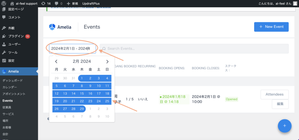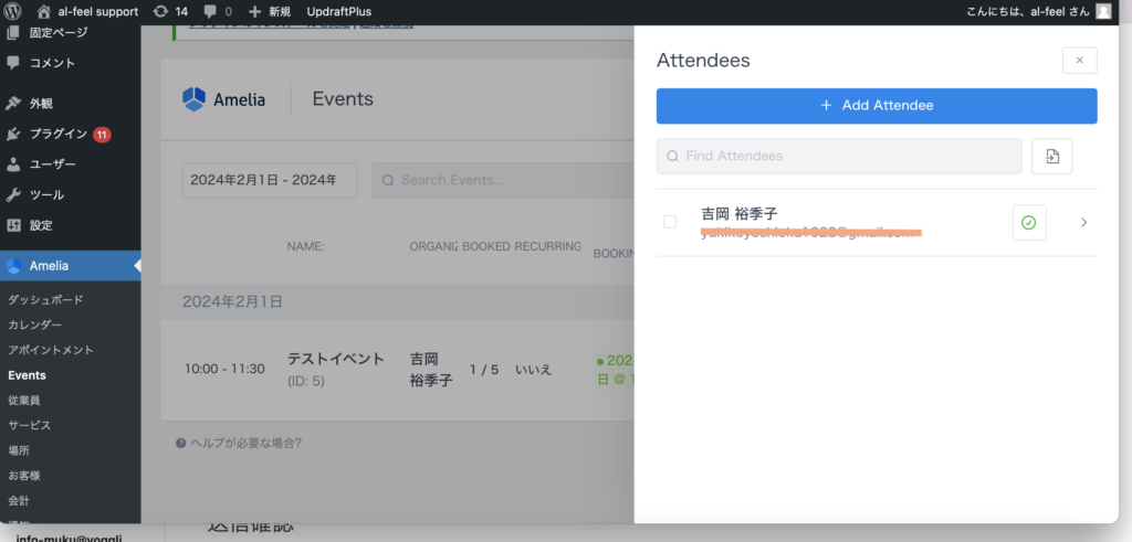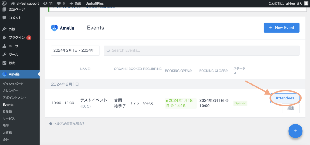 ゆきこ イベント予約(日時指定)のご予約確認方法をお伝えします! ご予約の確認方法/イベント予約(日時指定) Ameliaの「Evevts」の欄をクリックし、予約を確認したいイベントの「Attendees」をクリックするとご予約者が確認できます。 イベントが見つからない場合 左上のカレンダーの指定範囲が、閲覧したい時期に合っていないと表示されませんので、指定できているかを確認してください。