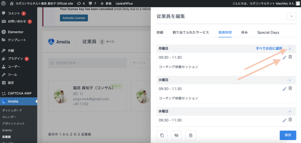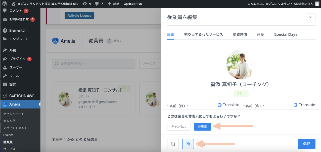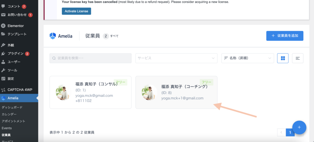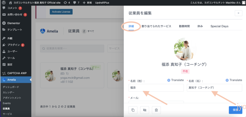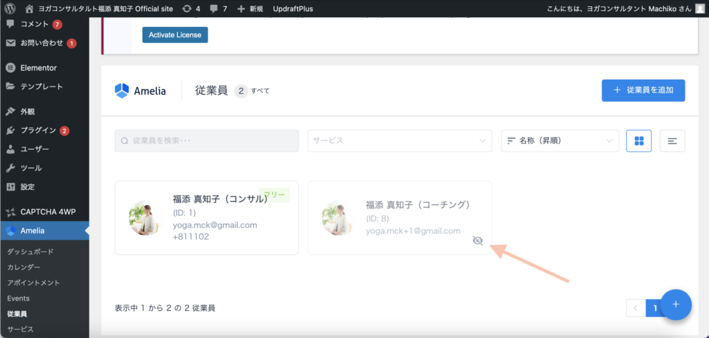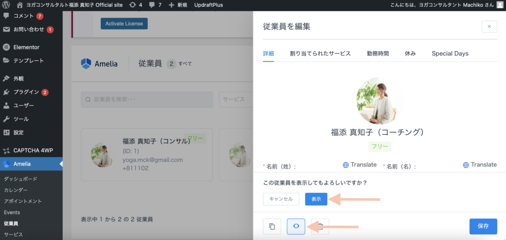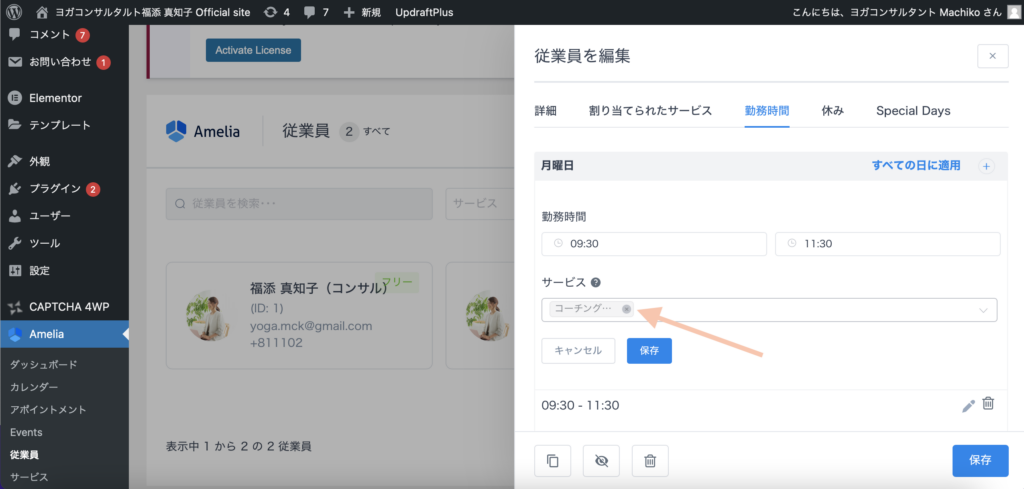 Ameliaの「従業員」の欄をクリックし、「福添真知子(コーチング)」をクリックします。
