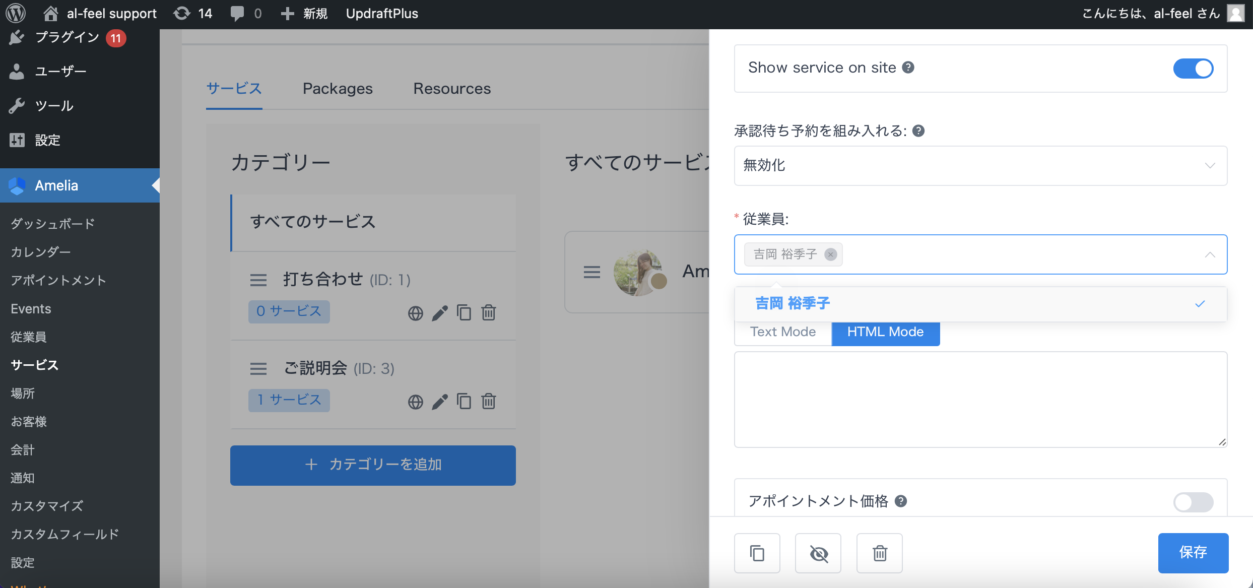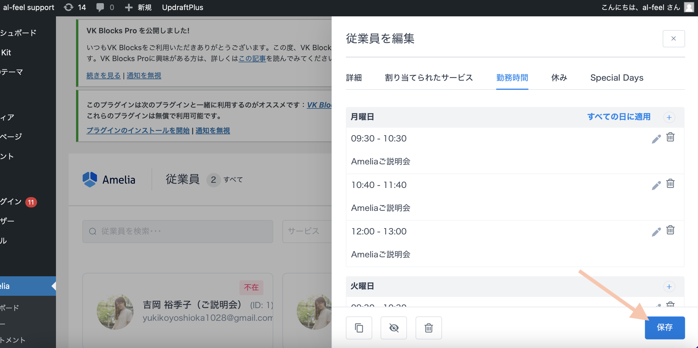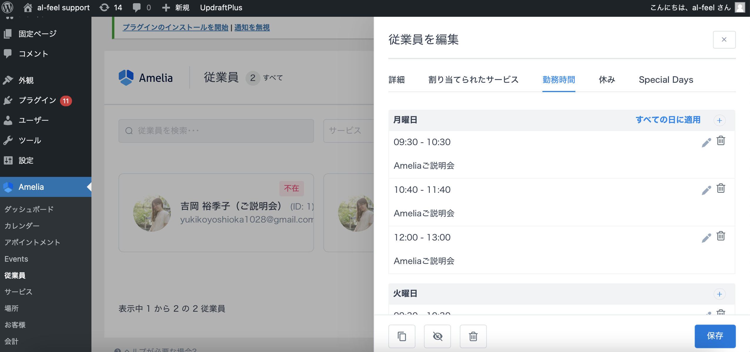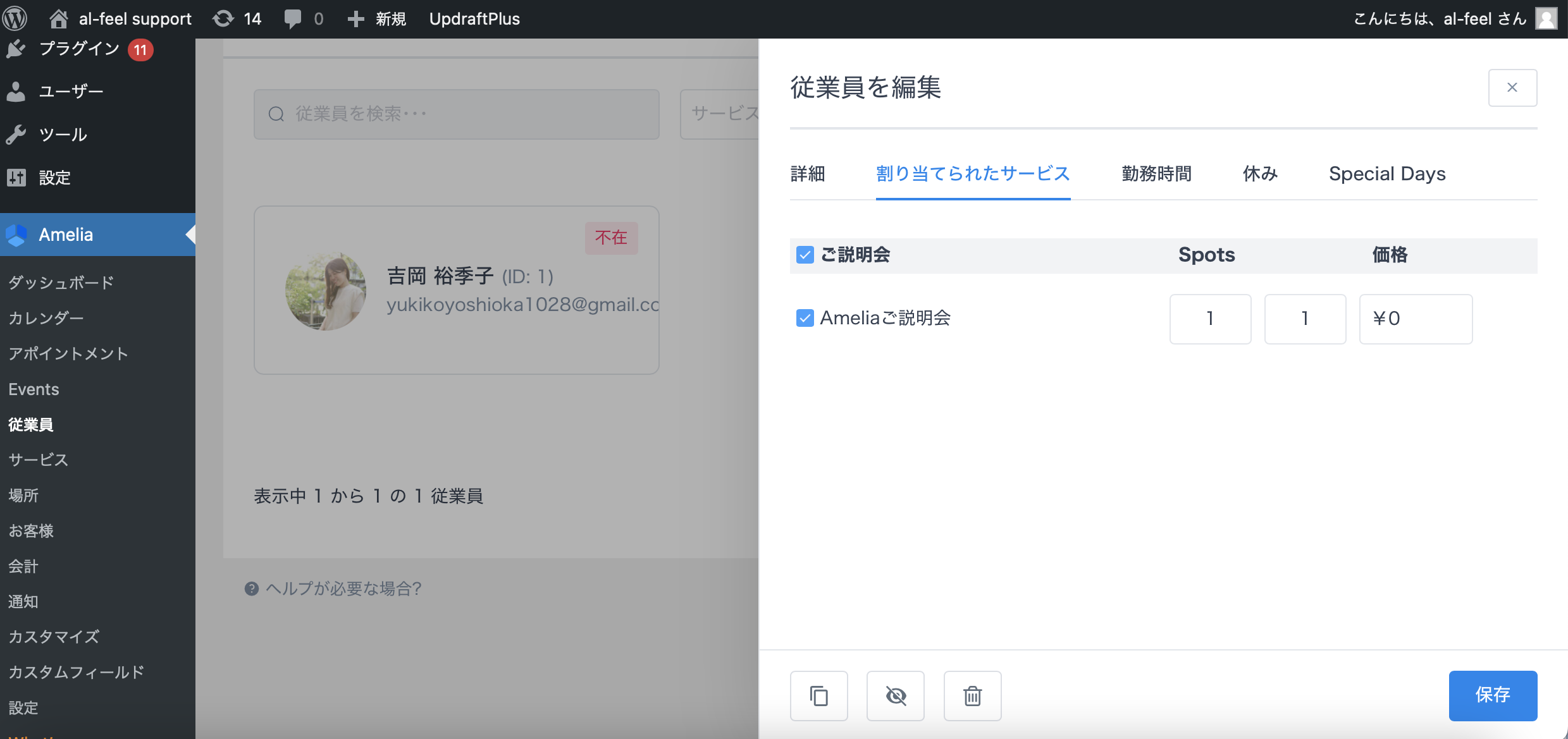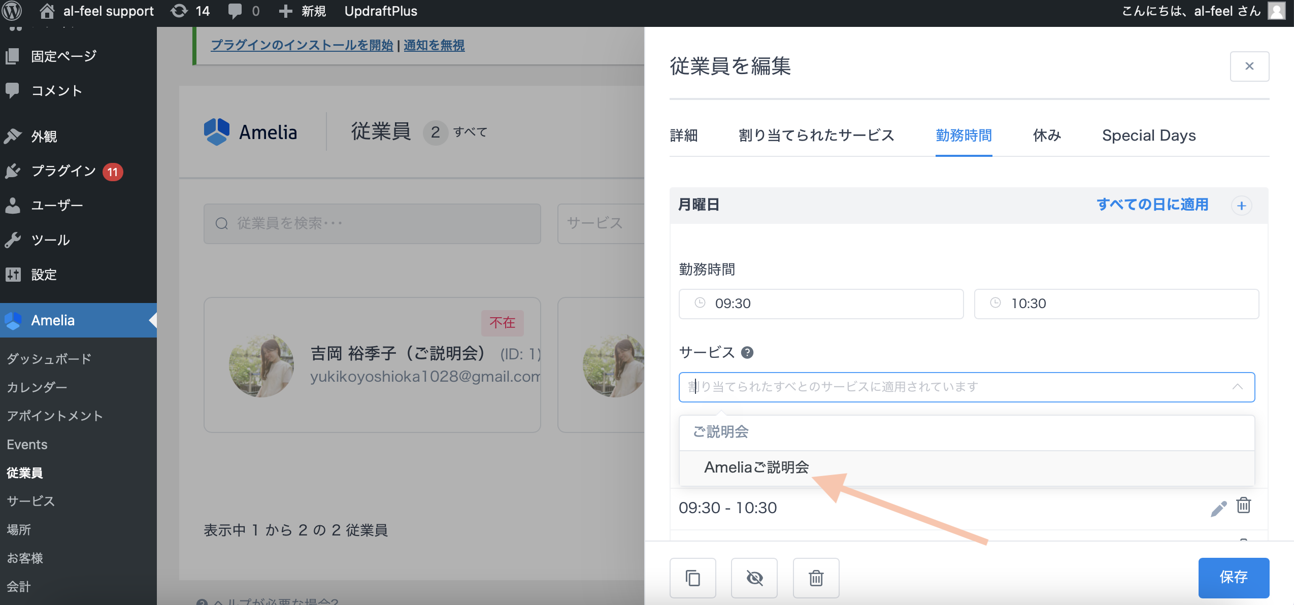 Ameliaの「従業員」の欄をクリックし、担当の従業員の枠をクリックします。