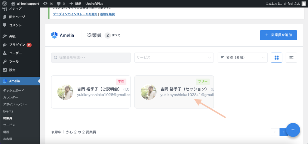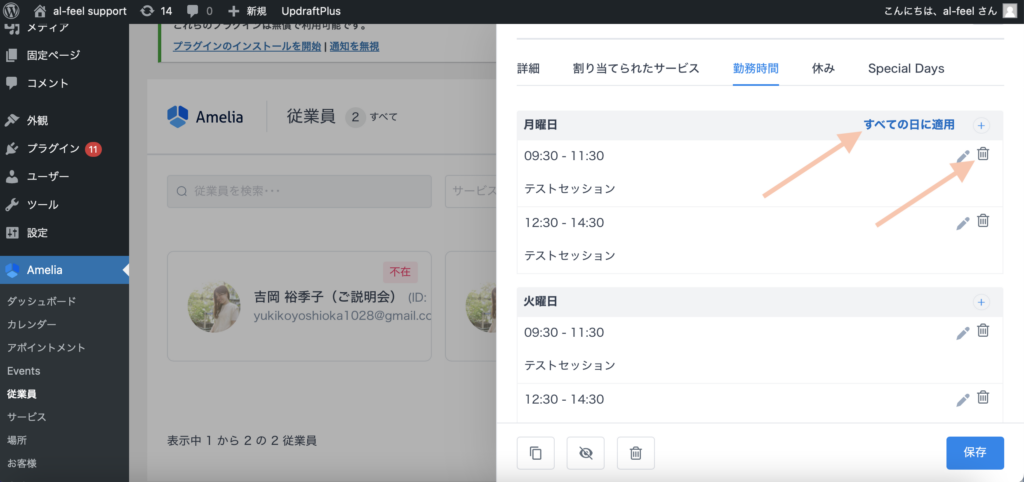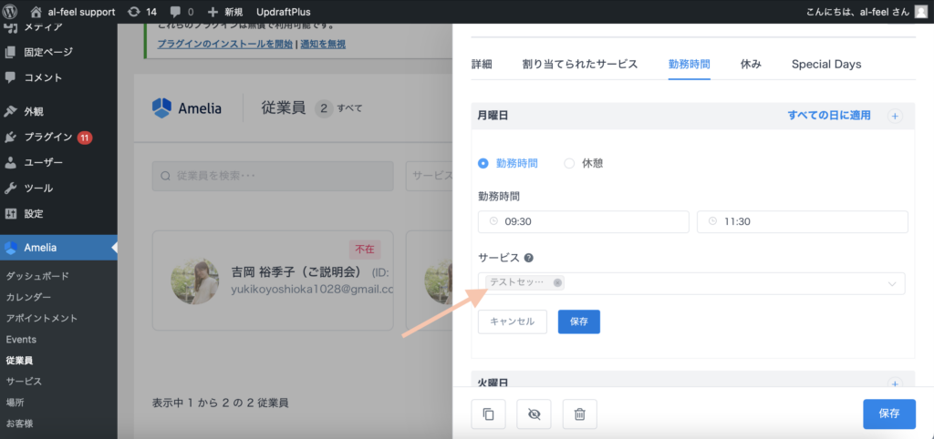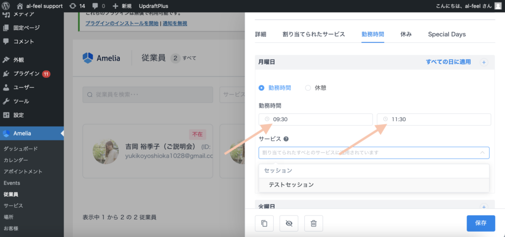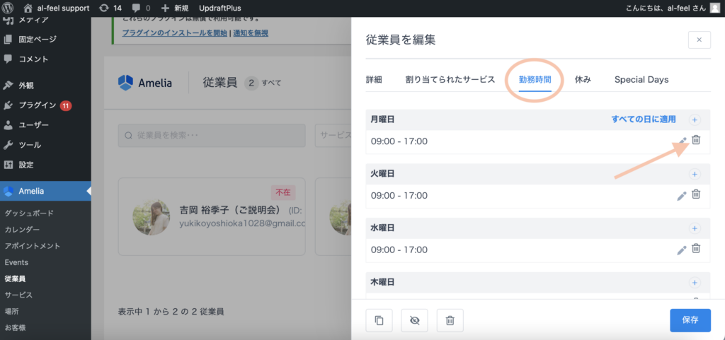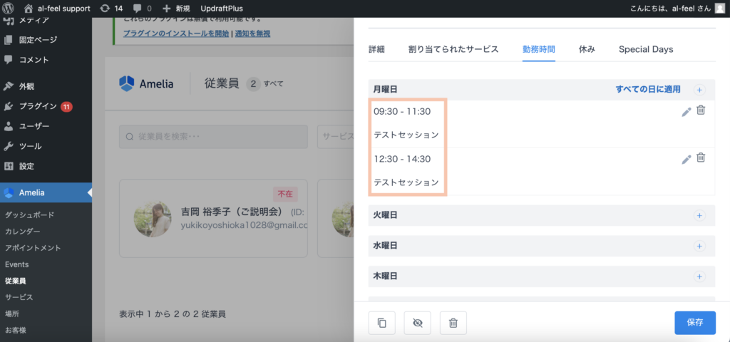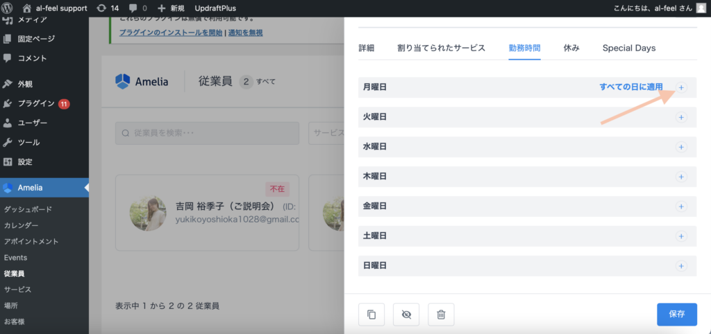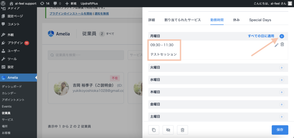 Ameliaの「従業員」の欄をクリックし、予約時間を指定したい「従業員」の枠をクリックします。