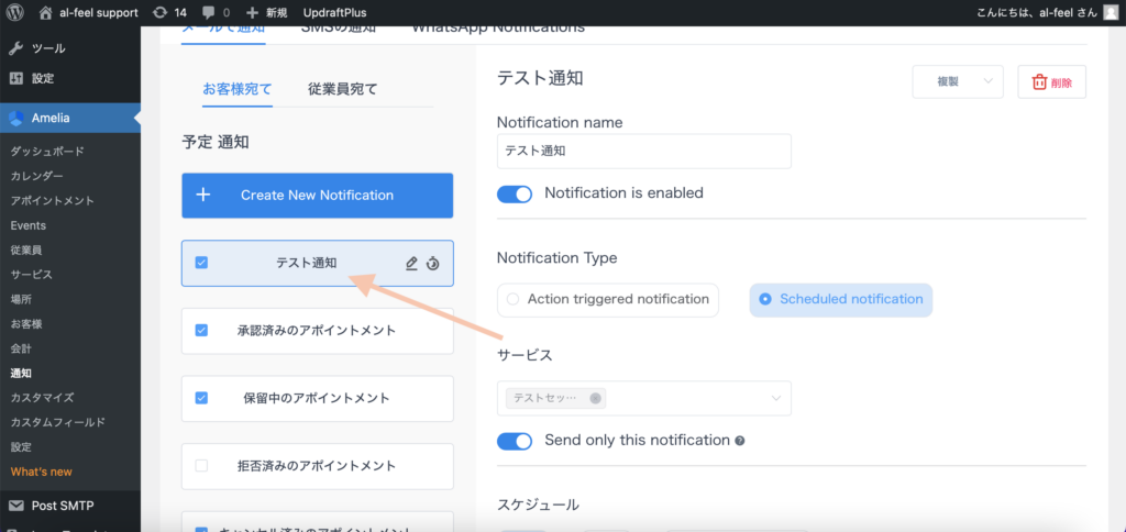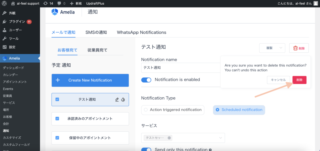Ameliaの「通知」を開き、削除したい通知をクリックします。